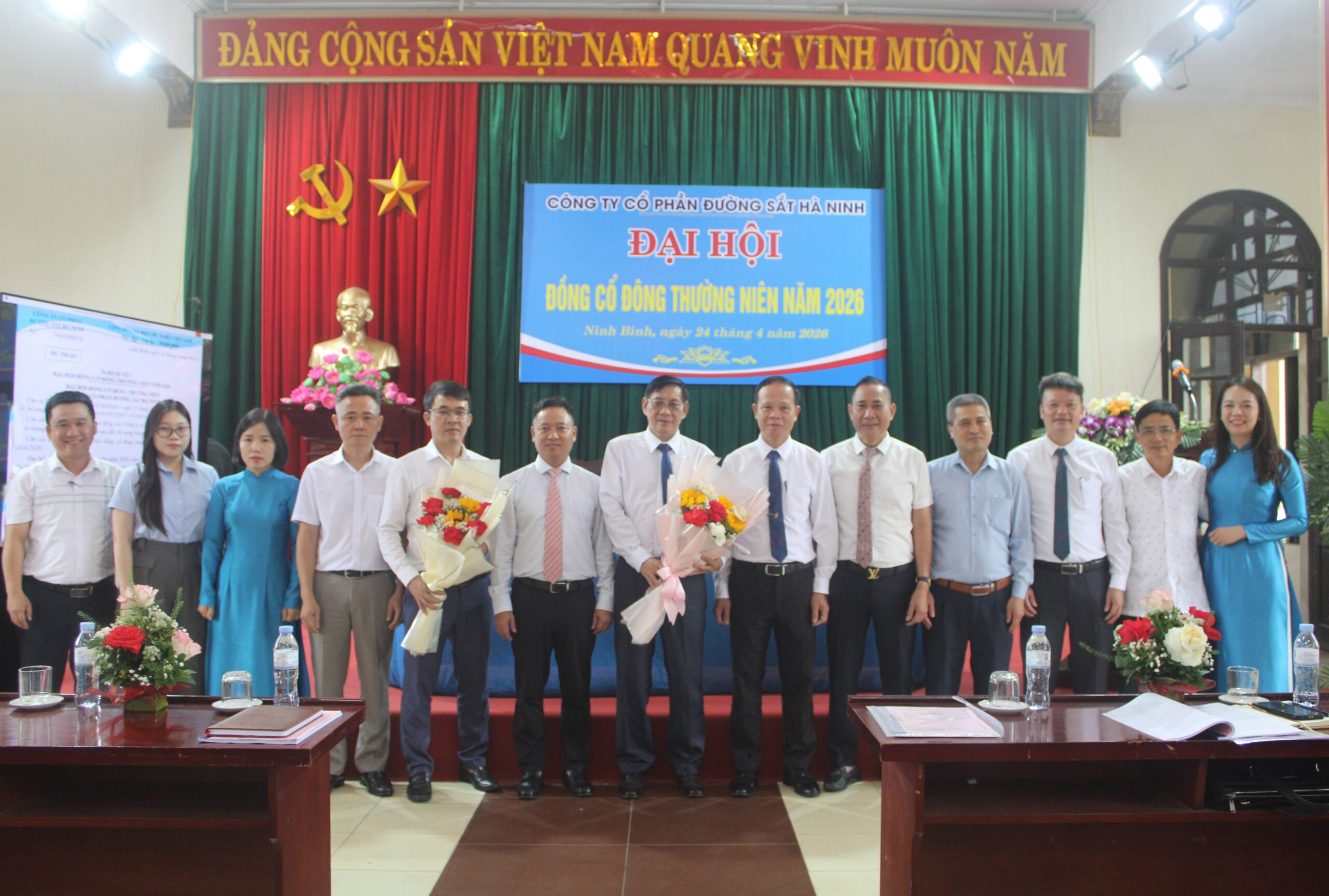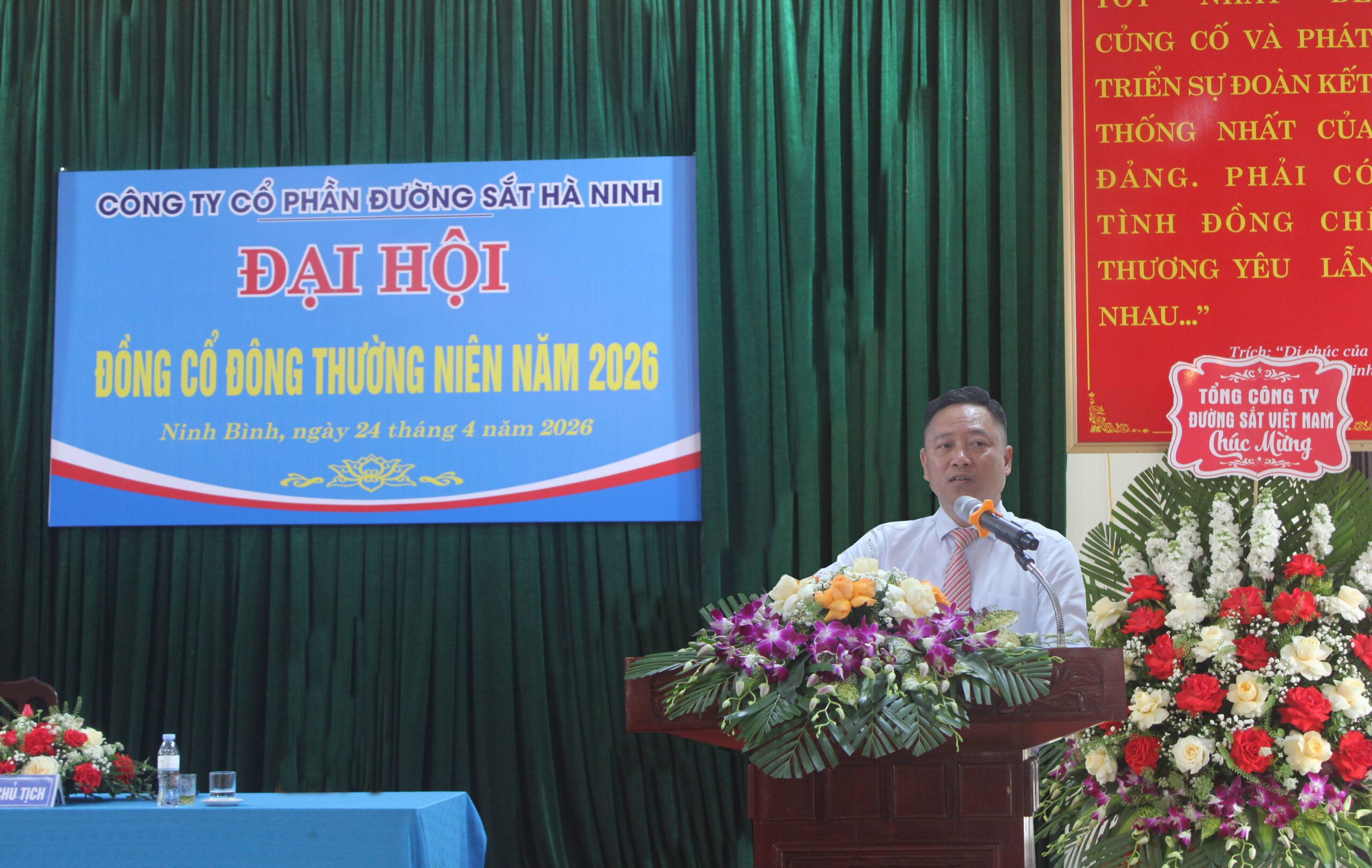 Ngày 24/4/2026, Công ty Cổ phần Đường sắt Hà Ninh đã tổ chức Đại hội đồng cổ đông thường niên năm 2026 trong không khí nghiêm túc, dân chủ và trách nhiệm. Đại hội có sự tham dự của ông Diệp Anh Tuấn, Ủy viên Ban Chấp hành Đảng bộ, Thành viên Hội đồng thành viên Tổng công ty Đường sắt Việt Nam; cùng các thành viên Hội đồng quản trị, Ban Giám đốc và đông đảo cổ đông của Công ty.