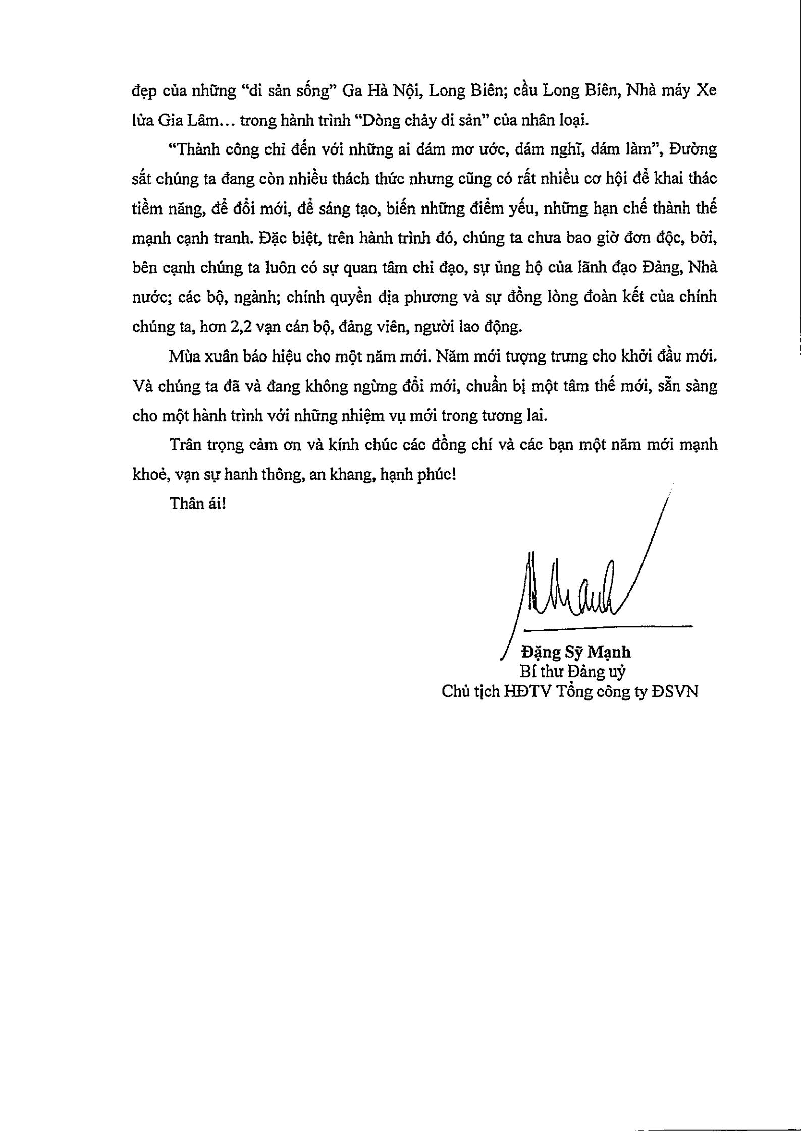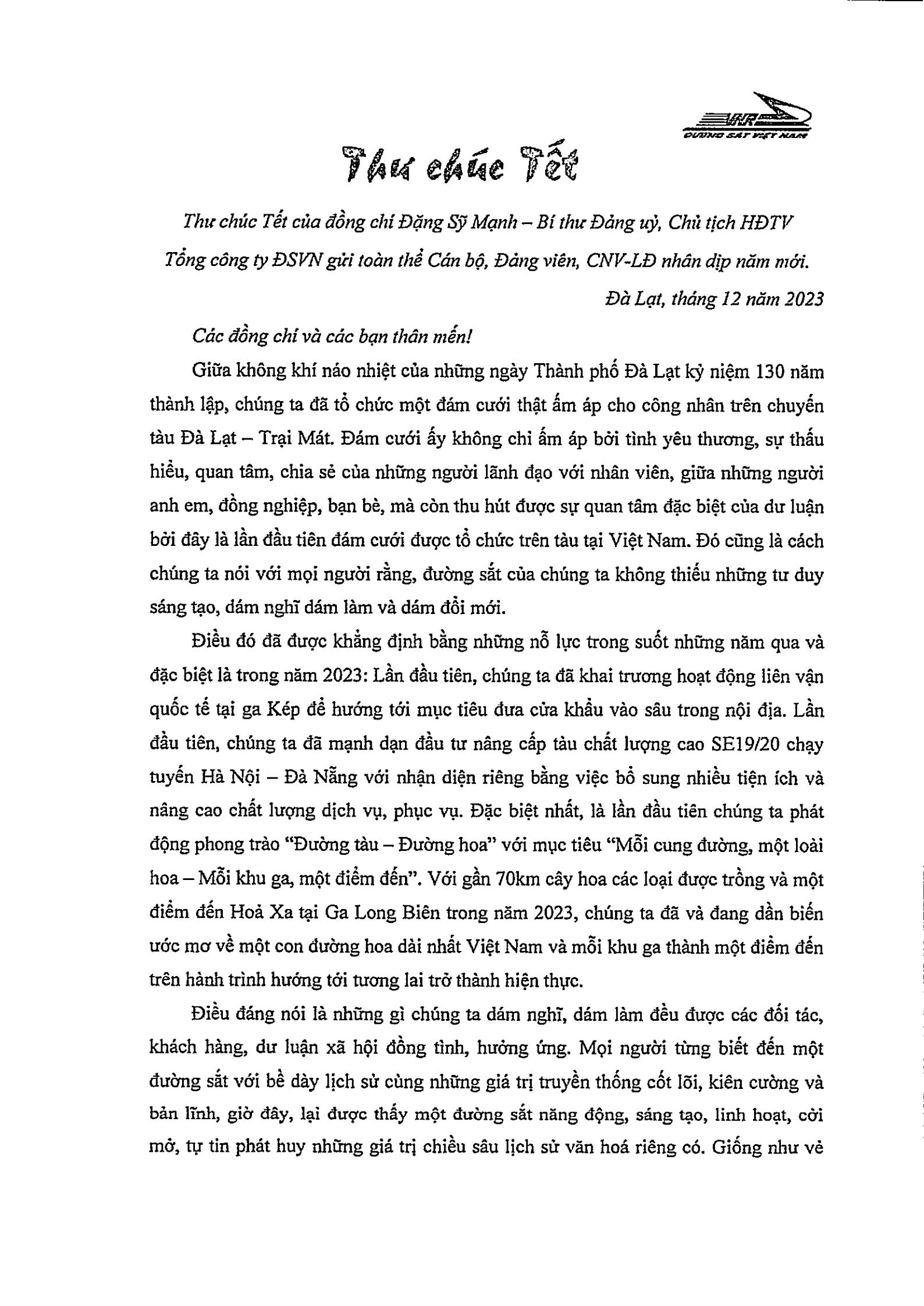 Tin nội bộ, TIN TỨC Thư chúc Tết mừng năm mới 2024 của đồng chí Đặng Sỹ Mạnh- Bí thư Đảng ủy, Chủ tịch HĐTV Tổng công ty ĐSVN.